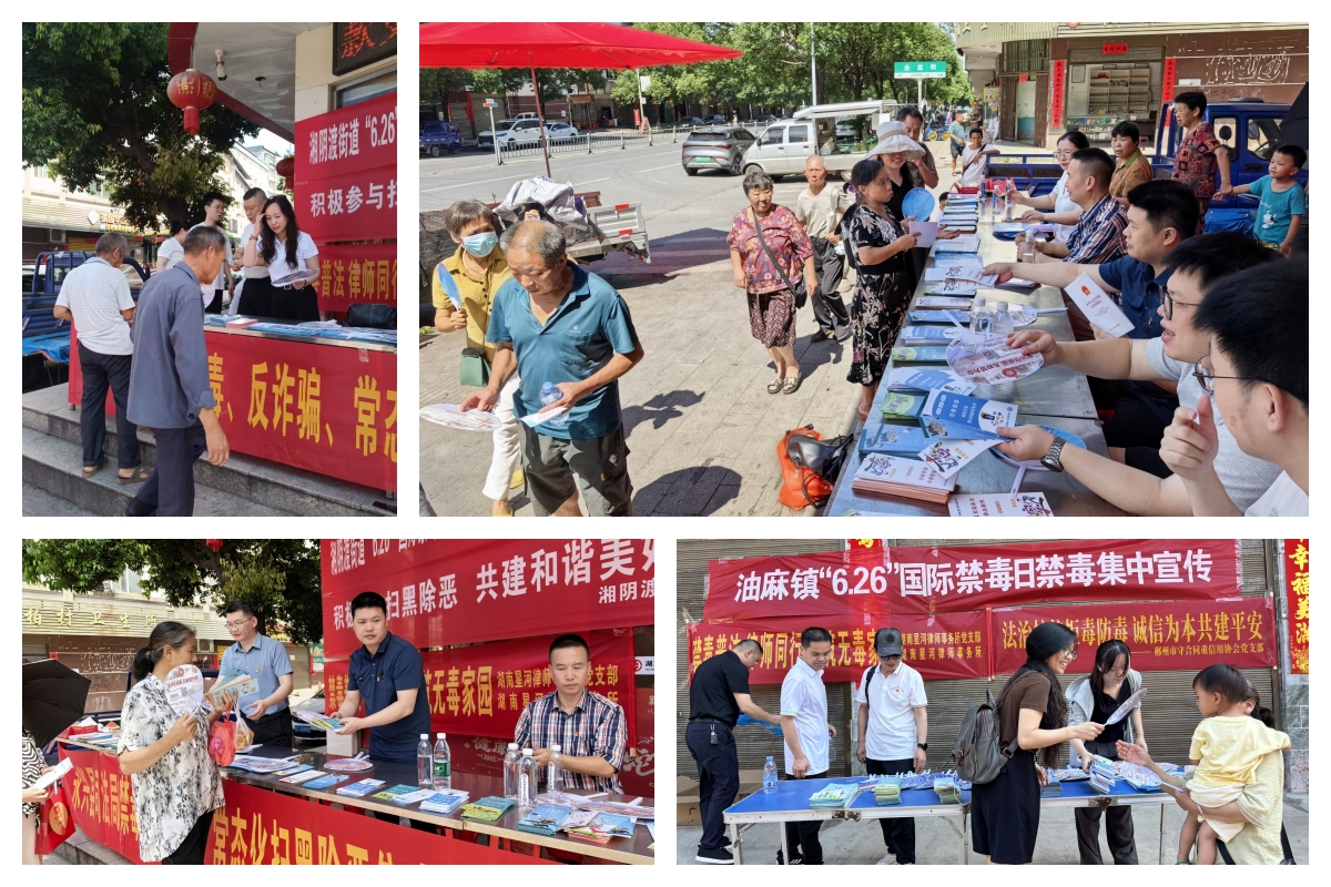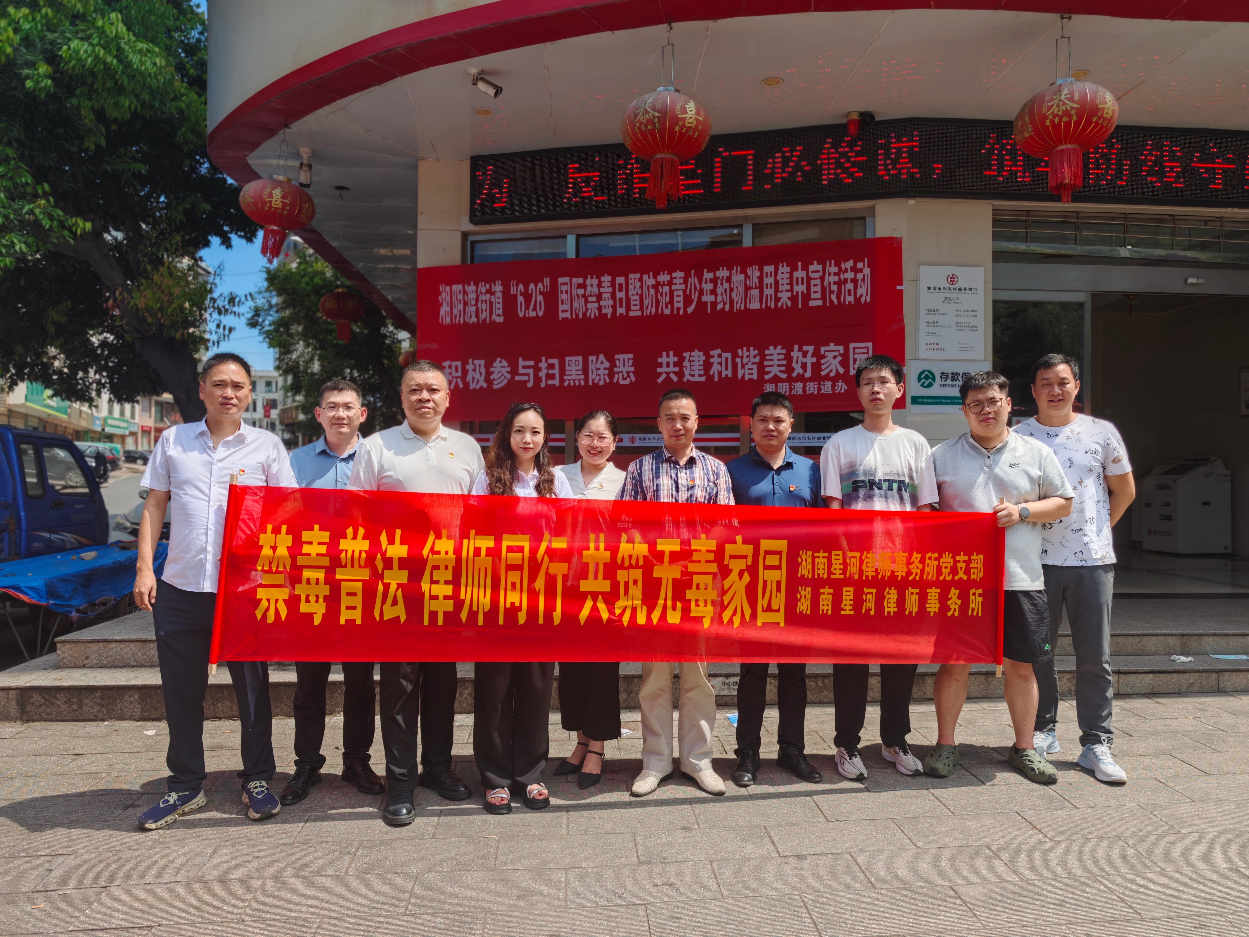 为进一步贯彻习近平总书记禁毒工作重要指示精神,不断提升群众禁毒意识与法治观念,6月26日国际禁毒日当天,湖南星河律所与郴州市守信协会赴永兴县湘阴渡街道、油麻镇等地联合开展“6.26”主题普法宣传活动。