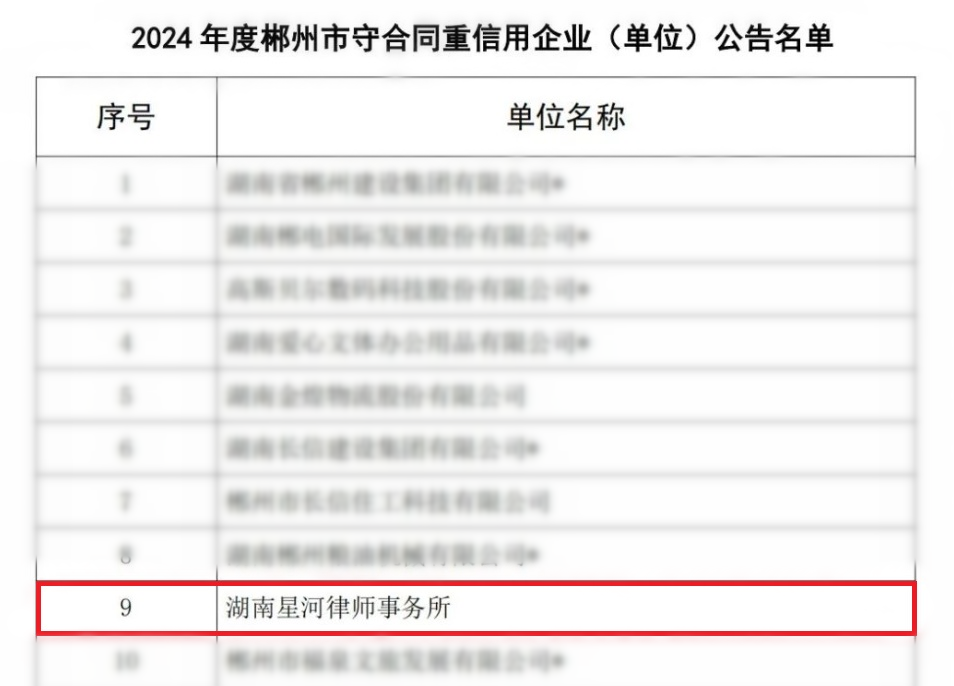 近日,郴州市守合同重信用协会对2024年度167家郴州市守合同重信用企业(单位)进行了公告,湖南星河律所名列其中,这是星河律所连续第三年获评郴州市守合同重信用企业(单位)称号,充分彰显了律所持之以恒的诚信经营、优质服务理念与高度的契约精神,在业内树立了坚实的信誉标杆。
